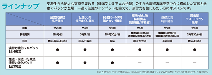 受験生の絶大な支持を集める【横溝プレミアム合格塾】の中から、「憲法・民法・行政法」の3科目の演習系講座を中心に構成した実戦力を磨くパック。